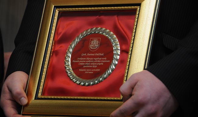 Pastarajam strategui už indėlį Klaipėdos sportui ir nuolat išugdomus čempionus įteiktas padėkos apdovanojimas.