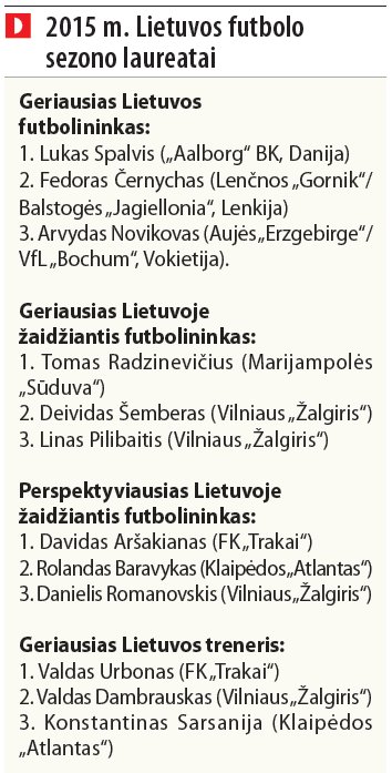 Paskelbus tradicinės futbolo specialistų, mėgėjų bei žurnalistų apklausos rezultatus paaiškėjo, kad šiais metais didžiausią įspūdį savo žaidimu ir pasiekimais padarė atakos smaigalyje žaidę bei rezultatyviais smūgiais pasižymėję futbolininkai. Geriausiu 2015 m. Lietuvos futbolininku buvo išrinktas Danijoje žaidžiantis „Aalborg“ klubo puolėjas Lukas Spalvis, geriausio Lietuvoje žaidžiančio futbolininko prizas atiteko Marijampolės „Sūduvos“ puolėjui Tomui Radzinevičiui, o perspektyviausiu Lietuvoje žaidžiančiu jaunuoju futbolininku buvo išrinktas „Trakų“ ekipos atakų lyderis Davidas Aršakianas.