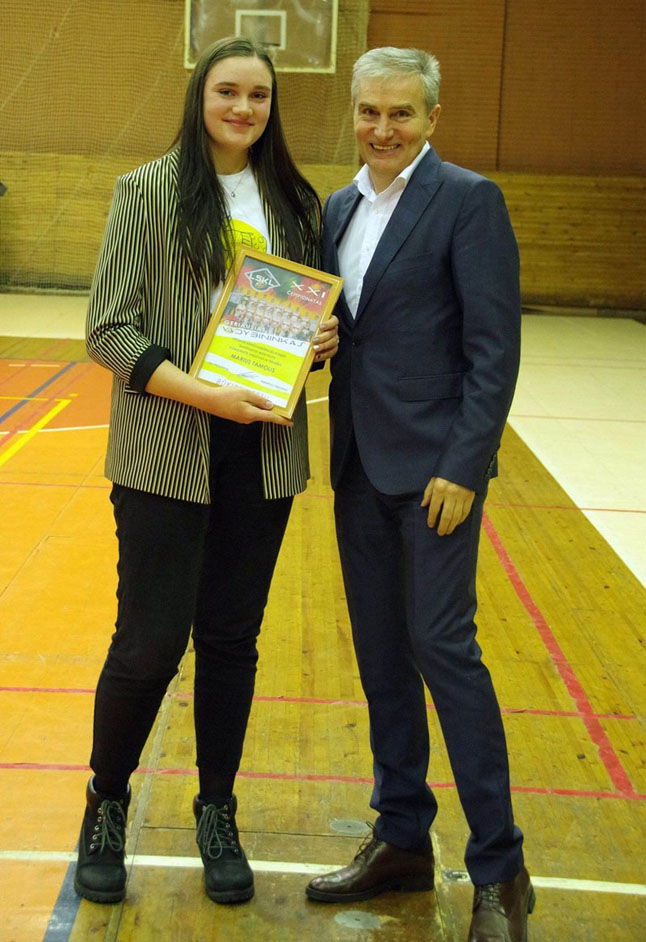 APDOVANOJO. LCC tarptautinio universiteto atstovė Lėja Jakštaitė atsiėmė geriausiam LSKL vadybininkui Mariui Tamoliui skirtą apdovanojimą. Prizą įteikė LSKL prezidentas Rimantas Cibauskas.