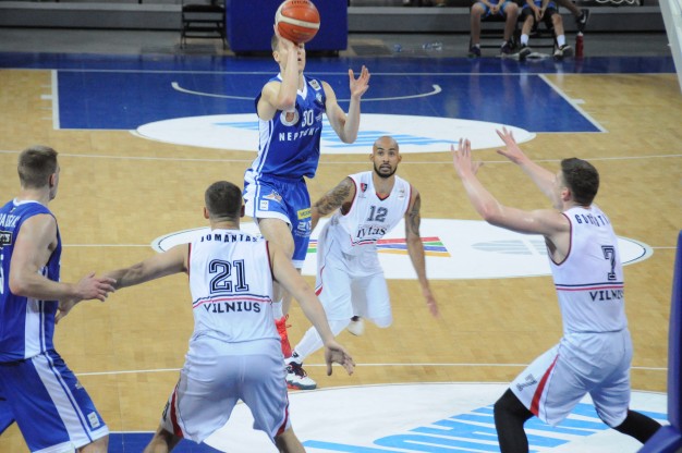 “Neptūnas” pirmąjį kėlinį laimėjo 21:16, o antrojo kėlinio pradžioje po Tado Klimavičiaus prasiveržimo su bauda ir komandos kapitono Martyno Mažeikos tritaškio klaipėdiečių pranašumas išaugo iki dviženklio – 27:16.