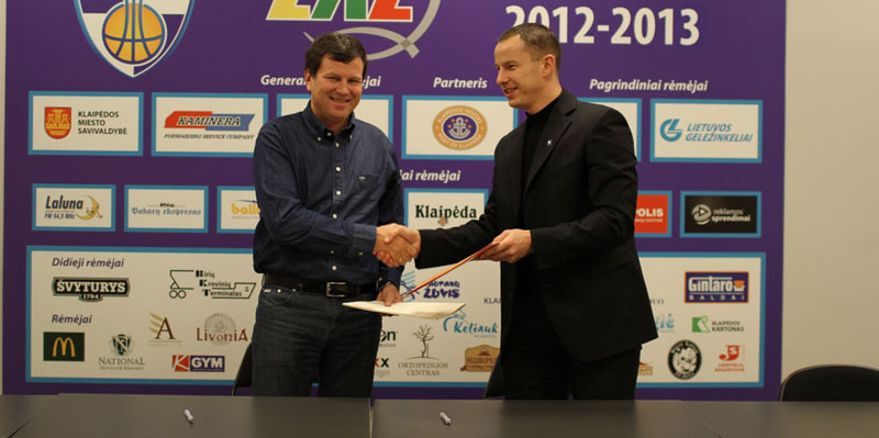 BENDRADARBIAVIMAS. Klaipėdos "Neptūno" klubo vadovas Osvaldas Kurauskas (dešinėje) ne tik prašo miesto paramos, bet ir nuolat aktyviai ieško bei bendrauja su galimais rėmėjais - įvairių įmonių vadovais ir verslininkais. Tai duoda vaisių - rėmėjų gretos plečiasi, pasirašomos vis naujos sutartys. Šį sezoną komandą sutiko paremti ir verslininkas Arūnas Tumas (kairėje).