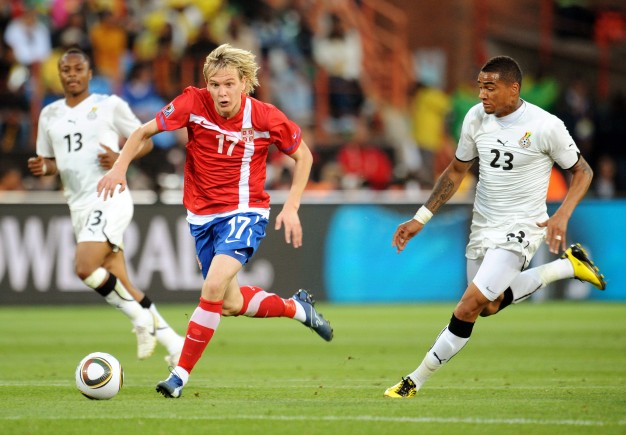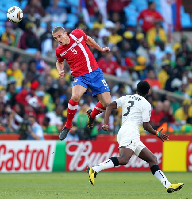 Pietų Afrikos Respublikoje vykstančio 19-ojo pasaulio futbolo čempionato D grupės pirmosiose rungtynėse sekmadienį Ganos rinktinė 1:0 (0:0) įveikė Serbijos futbolininkus.