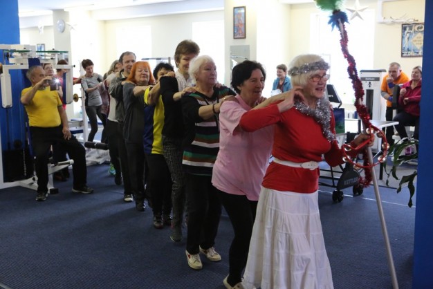 ŠOKO. Tiek senjorai, tiek neįgalieji nuoširdžiai, kai kurie net su džiaugsmo ašaromis akyse, su Kalėdų Seneliu šoko, dainavo. Vėliau visi kartu sėdo prie vaišėmis nukrauto stalo.