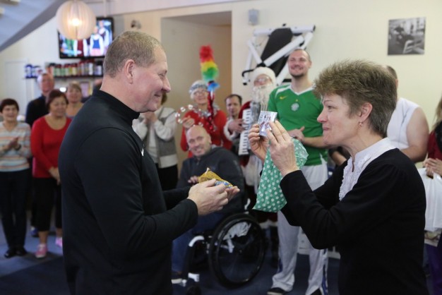 TRIJULĖ. Arūnas Jocys su Kalėdų Seneliu ir Snieguole neįgaliesiems ir senjorams surengė linksmą šventę.