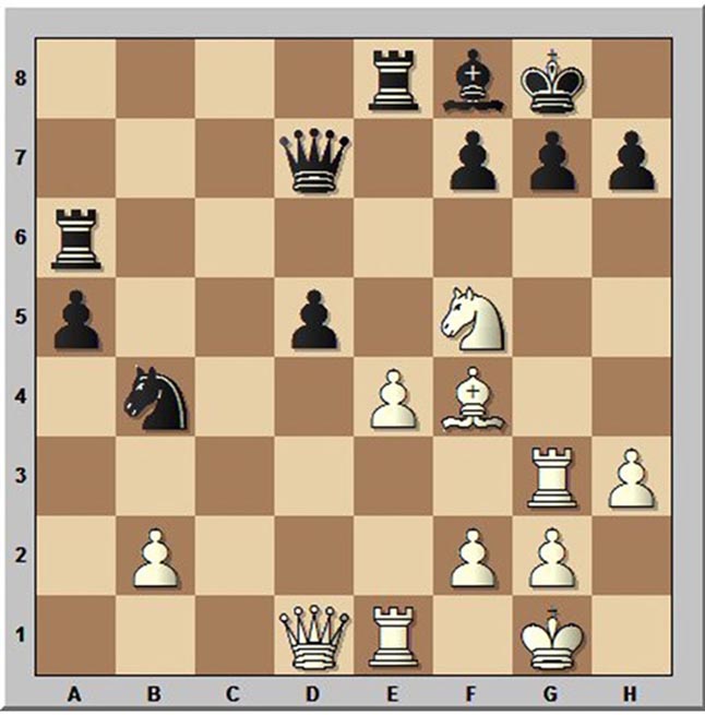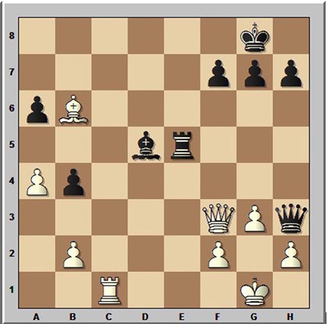 1 diagrama. 1. ... Rg1!! (puikus atveriamasis užpuolimas) 2. B:g1 (Jei 2 V:d7 Vh2x) 2.... B:d3-+