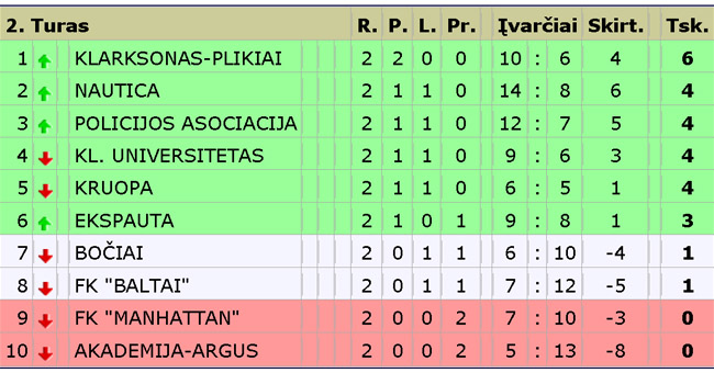 Po dviejų turų po keturis taškus turi "Nauticos", "Policijos asociacijos", "Klaipėdos universiteto" ir "Kruopos" komandos. Visos šios komandos iškovojo po vieną pergalę ir po kartą sužaidė lygiosiomis. "Nautica" pirmajame ture lygiosiomis 5:5 baigė rungtynes su "Policijos asociacija", o "Klaipėdos universitetas" antrajame ture taikiai 2:2 sužaidė su "Kruopa".