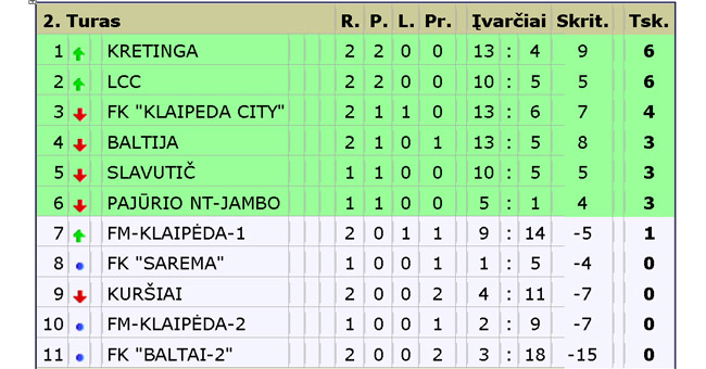 II-oje lygoje, kurioje žaidžia 11 komandų, dar nepasibaigus antrajam turui, po dvi pergales savoje sąskaitoje turi "Kretingos ir LCC komandos, taškų dar neprarado ir po vienerias rungtynes laimėjusios "Slavutič" ir "Pajūrio NT-Jambo" komandos, o "Klaipėda city" komanda kartą laimėjo ir kartą sužaidė lygiosiomis.