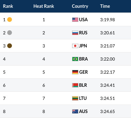 Greičiausia atrankoje buvo JAV rinktinė, kuri finišavo per 3 min. 23,22 sek.