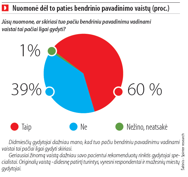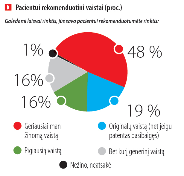 Vis dėlto gydytojai praktikai su šia valdžios atstovų pozicija nesutinka: Lietuvos šeimos gydytojų asociacijos ir Sveikatos žurnalistų asociacijos užsakymu atlikta apklausa atskleidė, kad kas antras medikas mano, jog generiniai ir originalūs vaistai skiriasi. Ryškiausias to įrodymas - 61 proc. apklaustųjų asmeniškai gydosi originaliais vaistais. Savo pacientams rinktis pigiausią vaistą siūlytų vos 16 proc. gydytojų, likusieji rekomenduotų vaistą konkrečiu pavadinimu, nors tai daryti gydytojams draudžiama.