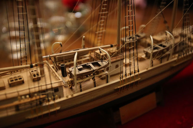 MAKETAS. Vakar burlaivyje "Meridianas" vykusiame Jūrų kapitonų asociacijos posėdyje jos narys kapitonas Aleksandras Romaškinas kolegoms pristatė naujausią savo darbą - "Meridiano" maketą. Egidijaus JANKAUSKO nuotr.