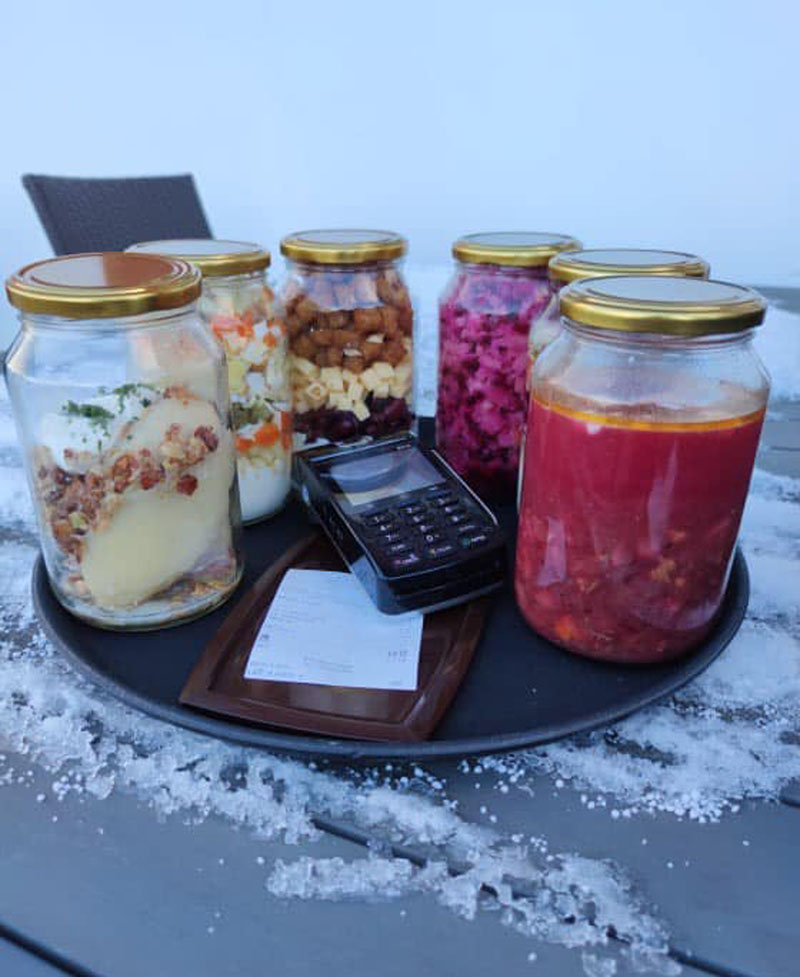 Originalią idėją įgyvendina restoranas "Pilies uostas", kuris nuo savaitgalio priima užsakymus ir maistą paruošia atsiimti vieno litro stiklainiuose. Tokioje taroje patiekiama sriuba, salotos, karšti patiekalai ir net desertas.