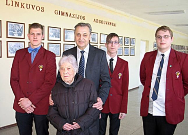 Linkuvos gimnazijos XX-osios laidos gimnazistė Anastazija Kanoverskytė Sučylienė kartusu direktoriumi Vaclovu Stapušaičiu ir mokiniais.