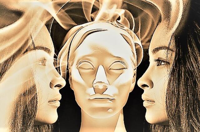 Profesorius paskleidžia ant stalo fotografijas. "Žiūrėkite. Gyvo žmogaus veidas būtent todėl ir yra toks išraiškingas, kad jis asimetriškas.