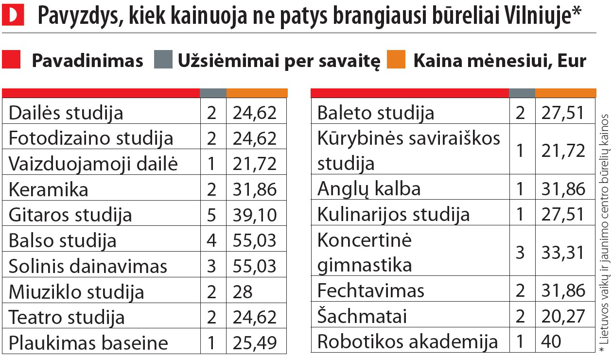 Dar viena dažna problema, su kuria susiduria šeimos, auginančios vaikus, - popamokinė veikla. Deja, ne visos Lietuvos šeimos gali leisti vaikus ugdyti neformaliuose užsiėmimuose. L.Sungailienė teigia, jog tai aktualu daugeliui Lietuvos šeimų: „Mes su vyru ieškojome tokių ugdymo įstaigų, kurios vaikus užimtų visą darbo dieną ir vaikas būtų ugdomas popamokine veikla. Nes juk viskas kainuoja, tie būreliai - irgi. Žinoma, džiaugiamės, kad atsirado tie papildomi 15 eurų iš mokinio krepšelio neformaliam ugdymui, bet, žinokite, Vilniuje tai šiek tiek juokinga suma. Bet jei vaikas tikrai gabus ir nori jį leisti į kelias veiklas, tu nebegali sau to leisti. Aš nežinau, kuri šeima gali sau leisti.“