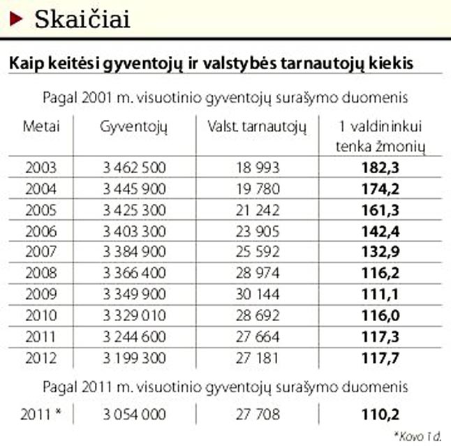 Štai 2003-iaisiais vienam valdininkui vidutiniškai teko rūpintis 182 žmonėmis, įskaitant senelius ir kūdikius, o dabar - vos 118. Per dabartinės Vyriausybės laikotarpį santykis dar labiau pasikeitė Vyriausybės nenaudai - valdininko aptarnaujamų žmonių skaičius sumažėjo 7-iais. Ir tai tik remiantis Statistikos departamento pranešimais apie gyventojų skaičiaus pokytį. O jis šiuo metu apskaičiuojamas pagal 2001 metų visuotinio gyventojų surašymo duomenis (tada buvo surašyti 3 483 972 gyventojai). Iš šio skaičiaus kiekvieną ataskaitinį laikotarpį vis atimamas į gyventojų registrą įtrauktų emigravusiųjų ir mirusiųjų skaičius, pridedamas imigravusiųjų ir gimusiųjų ir taip gaunamas statistinis gyventojų skaičius.
