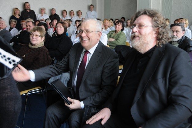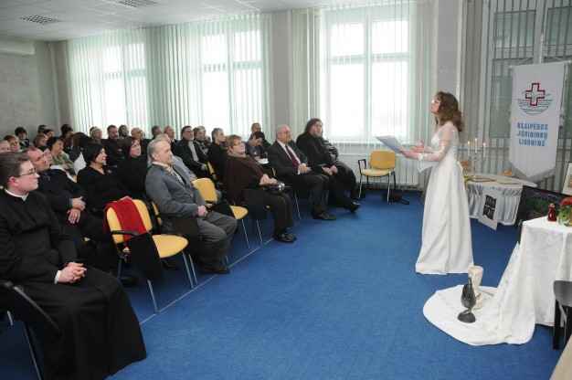 Advento popietėje su artėjančiomis Kalėdomis ligoninės medikus sveikino ne tik menininkai, bet ir vyriausiasis gydytojas Jonas Sąlyga, ligoninės kapelionas Saulius Stumbra ir šventine programa - dainininkė, tarptautinių konkursų laureatė Giedrė Zeicaitė, pianistė Edita Zizaitė bei aktorė Virginija Kochanskytė.