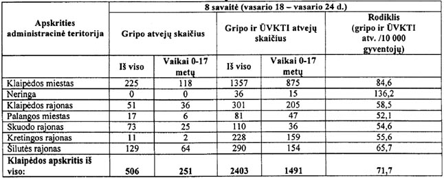 Palyginti su 7 savaite sergamumo rodiklis sumažėjo Klaipėdos, Kretingos bei Šilutės rajonuose. Visose šiose teritorijose Klaipėdos visuomenės sveikatos centro specialistai rekomendavo skelbti gripo epidemijos pabaigą.