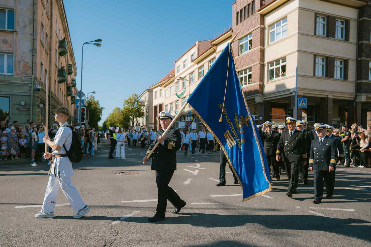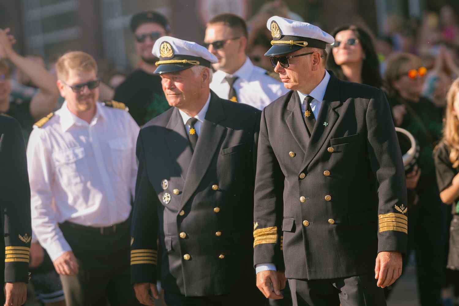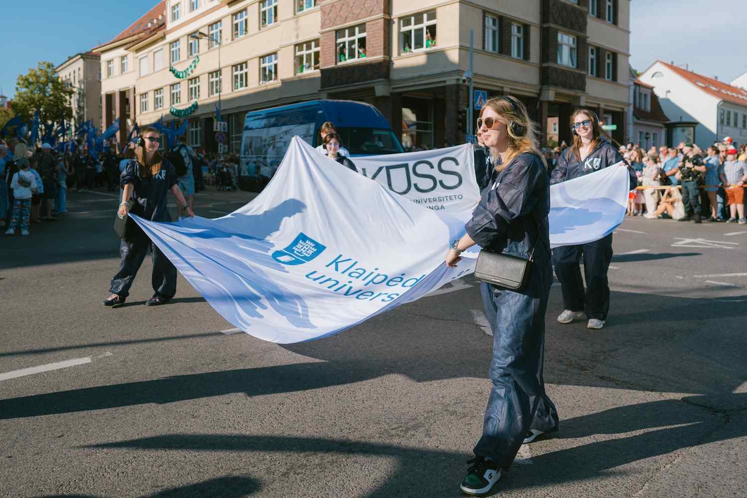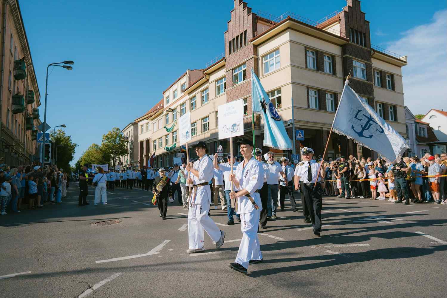 Eisenos priešakyje žengė Lietuvos karinių jūrų pajėgų orkestras, vadovaujamas Egidijaus Mikniaus, užtikrinęs pakilią nuotaiką nuo pirmosios akimirkos. Vilnius Tech Lietuvos jūreivystės akademijos studentai iškilmingai nešė Klaipėdos uosto, miesto ir Lietuvos vėliavas.