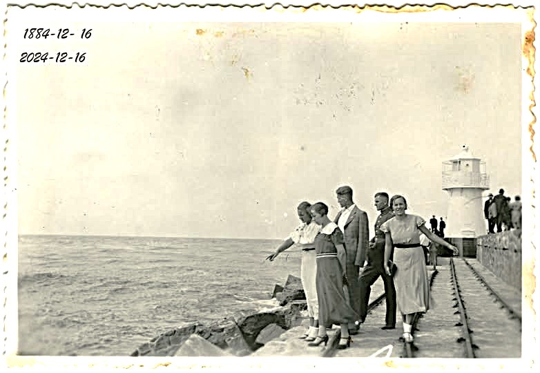 Nuotrauka iš Lietuvos jūrų muziejaus rinkinio. Lietuvaičiai vaikšto molo bėgiais prie Baltojo švyturio. Apie 1934 m.
