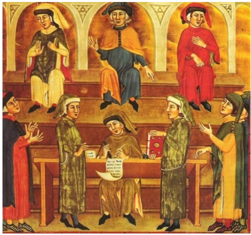 Notaro studija. Iliustracija iš XIV amžiaus rankraščio, surašyto Perudžoje ( Perugia; Italiaj).Šaltinis: http://imparareconlastoria.blogspot.com/2014/09/la-cultura-nel-basso-me…