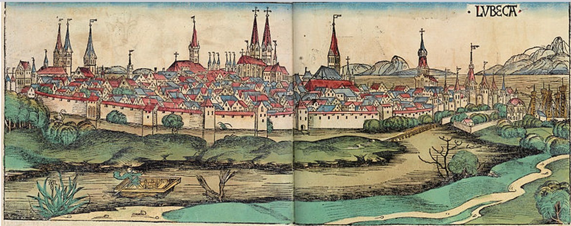 Liubeko panorama. Iliustracija iš lotyniškos „Niurembergo kronikos“ ( 1493). Šaltinis: http://www.obrasraras.usp.br/obras/000192/