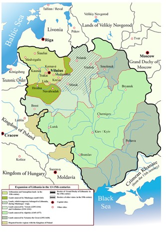 Lietuvos valstybės plėtros XIII- XV a.teritorinis žemėlapis . Šalt. https://commons.wikimedia.org/wiki/File:Lithuanian_state_in_13-15th_cen…