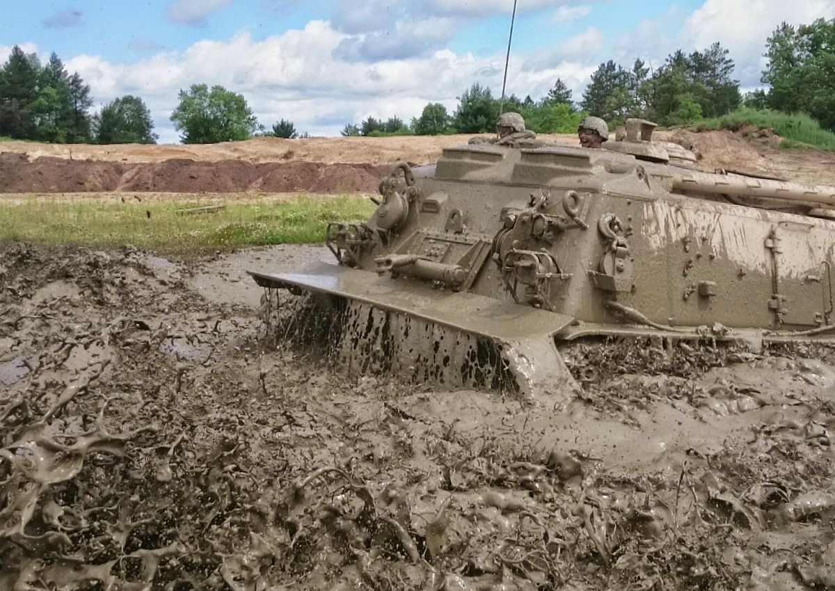 „Kariuomenės atstovai kalba apie tai, kad šarvuotį nuo vandens paviršiaus skiria du metrai tiršto purvo, dėl kurio negalima pasiekti šarvuočio ir prikabinti lynų.“