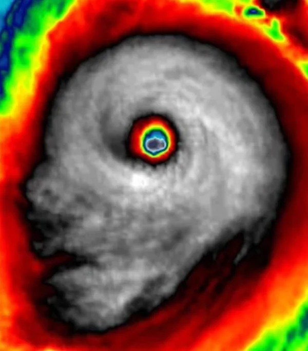Dabar „Weather Channel“ vyresnysis meteorologas Stu Ostro pasidalijo šiurpia nuotrauka, atskleidžiančia, kad likus vos kelioms akimirkoms iki uragano smūgio Floridai, jis įgavo kaukolės formą.