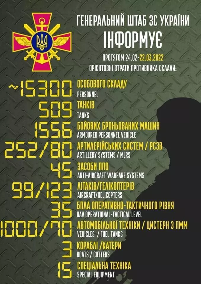 11:05 Ukrainos Generalinis štabas pateikia tokius Rusijos nuostolius: 15 300 kareivių ir karininkų, 509 tankai, 1556 šarvuočiai, 252 artilerijos sistemos, 80 salvinės ugnies kompleksų, 45 priešlėktuviniai kompleksai, 99 lėktuvai, 123 sraigtasparniai, 1000 automobilių, 3 laivai ir kateriai, 70 degalų cisternų, 35 dronai.