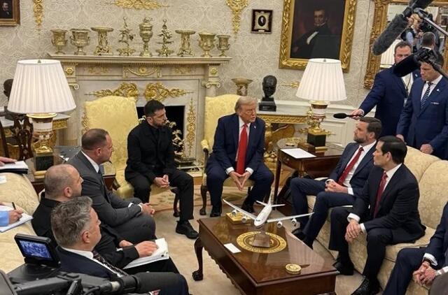 Tada Trumpas draugiškai perėjo prie gestų – apsikabino Zelenskį už peties ir abu kartu įžengė į Ovalinį kabinetą.