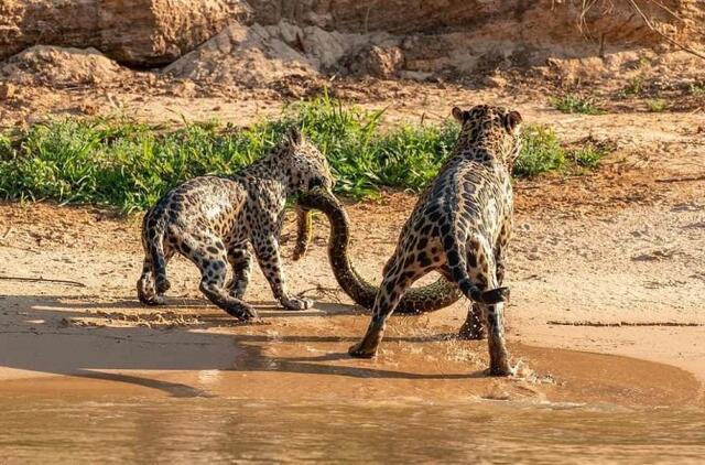 Jis užfiksavo didelę dėmėtąją katę, kurios gniaužtuose atsidūrė kitas grėsmingas roplys - anakonda.