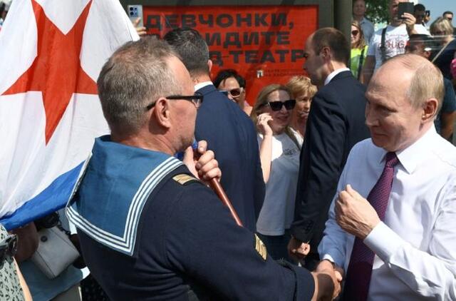 Tuo metu fone Putinas spaudžia rankas paradinėmis uniformomis apsirengusiems kariams. Šalia jo stovi Rusijos gynybos ministras Andrejus Belousovas.
