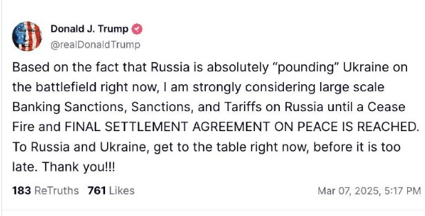 Penktadienį, kovo 7 d., savo socialiniame tinkle „Truth Social“ jis parašė, kad sankcijos gali būti įvestos, nes Rusija ir toliau daro spaudimą mūšio lauke.