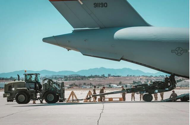 "JAV jūrų pėstininkų korpuso haubica M777 kraunama į JAV oro pajėgų lėktuvą C-17 Globemaster III Maršo oro pajėgų bazėje, Kalifornijoje, teikiant JAV saugumo pagalbą Ukrainai", - sakoma pareiškime.