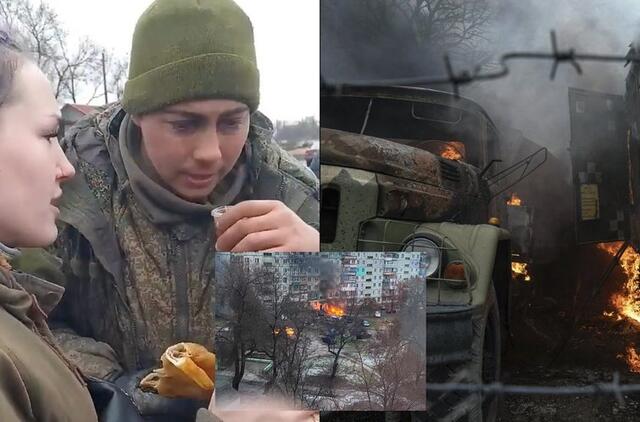 Vaizdo įraše užfiksuotas būrys ukrainiečių, kurių dauguma – moterys, o tarp jų stovintis pasidavęs karys verkia ir valgo jų pasiūlytą bandelę su arbata.