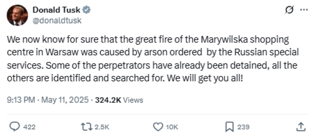 Taip pat Lenkijos ministras pirmininkas pažymėjo, kad šiuo metu Lenkijos teisėsaugos institucijos jau sulaikė keletą asmenų, susijusių su prekybos centro „Marywilska“ padegimu Varšuvoje. Kiti, pasak D. Tusk, šiuo metu yra ieškomi, jų tapatybės yra nustatytos.