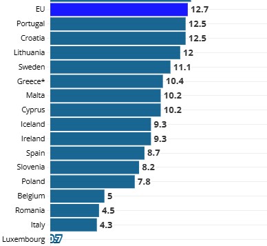 Tarp ES „didžiojo ketverto“ šalių Vokietijoje (17,7 proc.) ir Prancūzijoje (13,9 proc.) atotrūkis buvo didesnis už ES vidurkį.