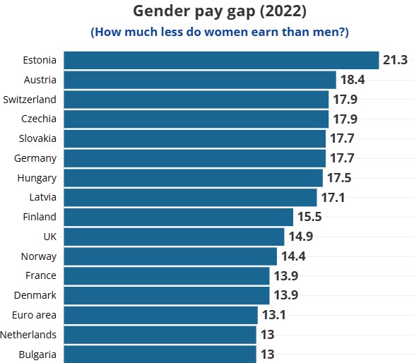 Didžiausias vyrų ir moterų darbo užmokesčio skirtumas buvo Estijoje (21,3 proc.), po jos sekė Austrija (18,4 proc.), Šveicarija ir Čekija (abi po 17,9 proc.).