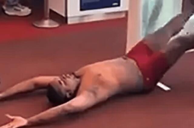 Socialiniuose tinkluose išplatintame vaizdo įraše matyti, kaip vyras guli ant grindų, stovi ant keturių, mojuoja rankomis ir kažką burbuliuoja.