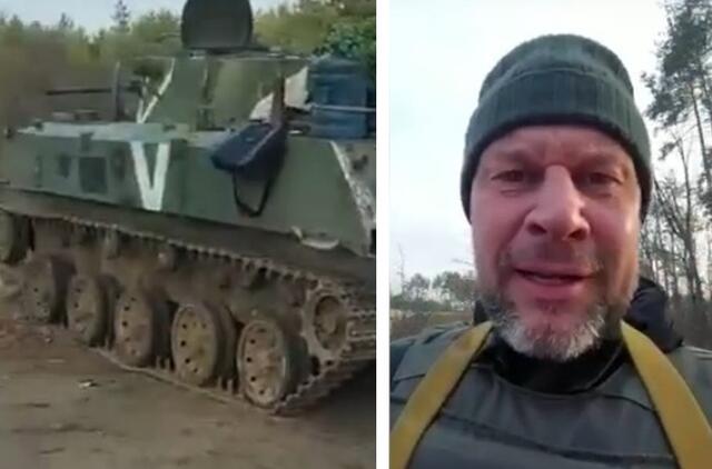 „Tai net ne žmonės“, – vaizdo įraše sako ukrainiečių karys, vaikščiodamas tarp suniokotų transporto priemonių, ir priduria, kad du rusų leitenantai pateko į nelaisvę.