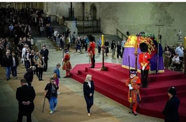 Karalienė guli Vestminsterio salėje nuo trečiadienio, kai jos karstas buvo atvežtas iš Bakingemo rūmų į istorinę vietą, kad žmonės galėtų ateiti ir atiduoti pagarbą.