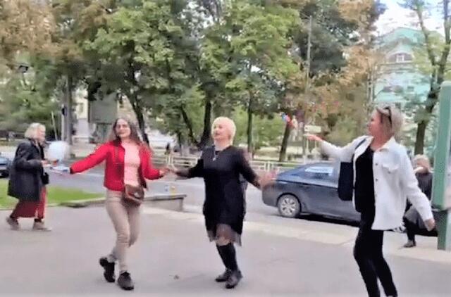 Dainuojant "Hutoryanka", mergina raudona striuke, blondinė juoda suknele ir moteris pilka striuke ėmė šokti ant šaligatvio prie rinkimų apylinkės.