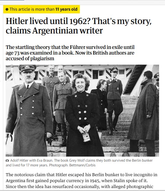 2011 m. knygos „Pilkasis vilkas: Adolfo Hitlerio pabėgimas“ (Grey Wolf: The Escape of Adolf Hitler), pagal kurią buvo sukurtas dokumentinis filmas, autorius Argentinos žurnalistas apkaltino plagijavimu.