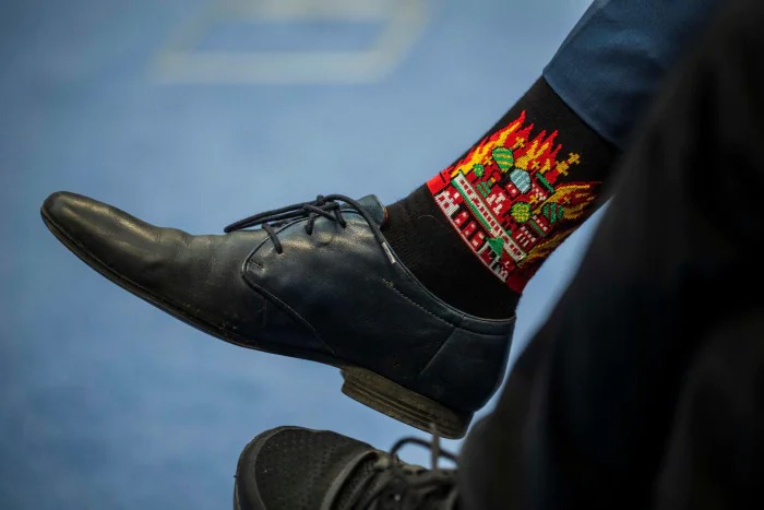Bet ukrainietiškos kojinės, ant kurių simboliškai pavaizduota, kaip atrodytų, jei tas pats vyktų jų miestuose, juos supykdė.