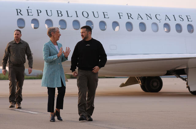 Kaip teigiama, V. Zelenskį į pietvakarius nuo sostinės Paryžiaus esančioje Vilakublė oro bazėje pasitiko šios šalies premjerė Elisabeth Borne.
