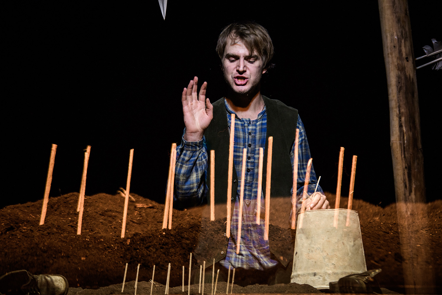 Svarbiausia sceninio žaidimo terpe virsta žemė. Iš jos iškyla visi pasakojimo veikėjai, ja lakoniškai perteikiami istoriniai karo veiksmai bei pasekmės. Nors kūrinys pasakoja apie skaudžius dalykus, svarbią vietą čia užima žaismė, šviesa ir haiku - japoniškas eilėraštis, keletu žodžių „nutapantis“ gamtos peizažą, simbolizuojantį vidinius žmogaus išgyvenimus.