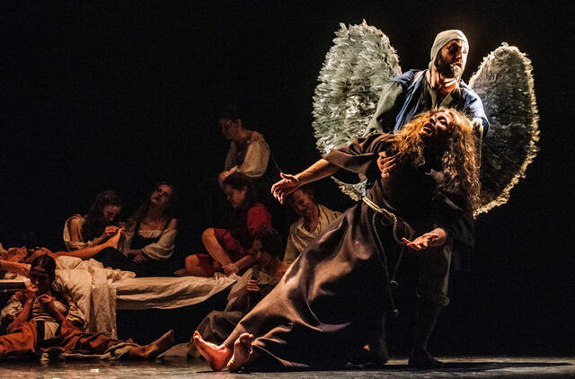 19 val. Klaipėdos dramos teatre spektaklis „Tarp Lenos kojų, arba “Švenčiausiosios Mergelės Marijos mirtis„ pagal Mikelandželą Karavadžą“.