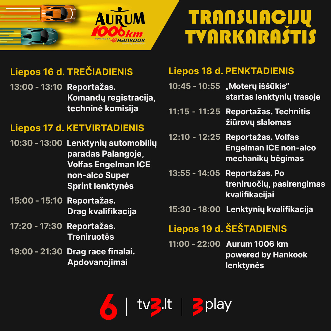 Kiekvieną vasarą variklių riaumojimas ir svylančių padangų kvapas jaučiamas ne tik Palangoje, kuri tradiciškai ima gyventi „Aurum 1006 km powered by Hankook“ lenktynių festivalio ritmu. Visa tai liepos 16-19 dienomis pajus ir TV3 žiniasklaidos grupės žiūrovai, kurie ir šiemet kviečiami patys tapti šio didžiausio automobilio sporto šalyje renginio dalimi. Tačiau kur visų akys kryps šiemet?