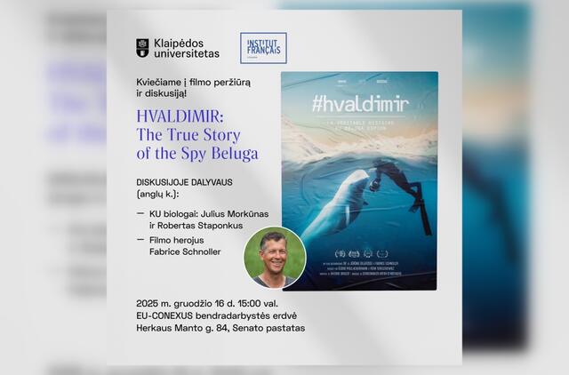 Filmo „#Hvaldimir: The True Story of the Spy Beluga“ peržiūra ir diskusija vyks gruodžio 16 d. 15 val. Klaipėdos universiteto EU-CONEXUS bendradarbystės erdvėje (Senato pastatas, H. Manto 84, Klaipėda).