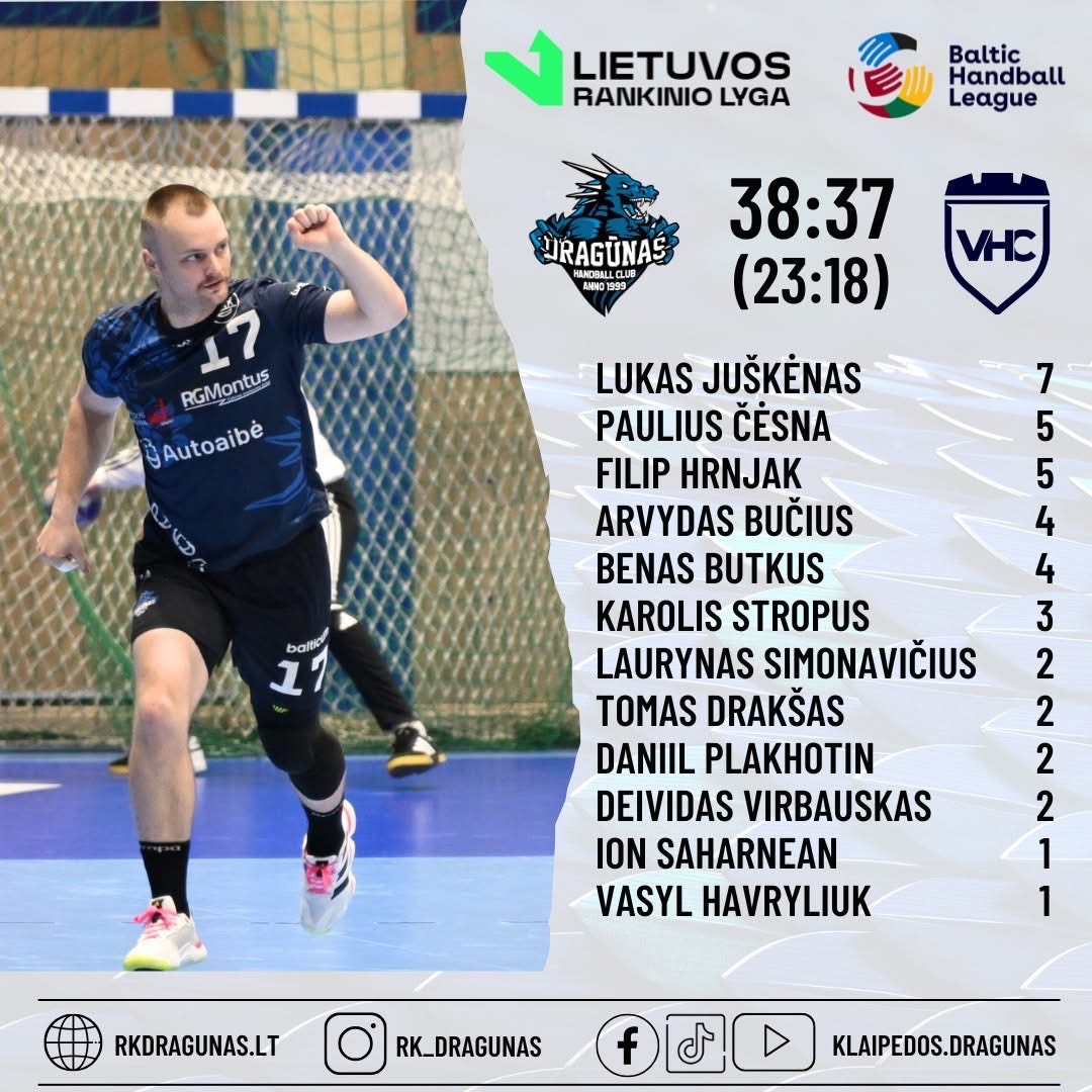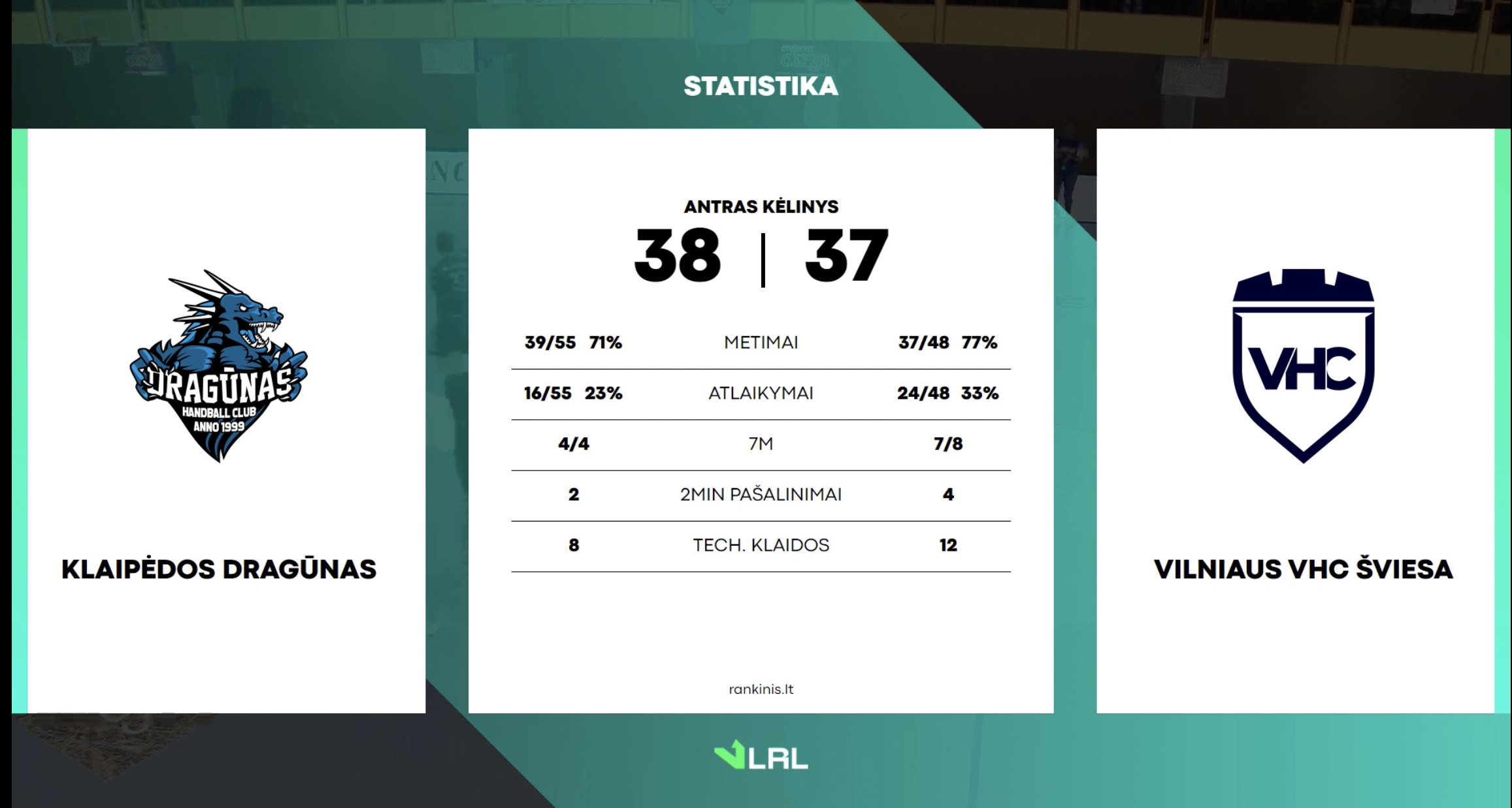 Iki rungtynių pabaigos likus dviem minutėms, jie sušvelnino atsilikimą iki dviejų įvarčių – 35:37 ir dar bandė kabintis. Tačiau netrukus taikliu baudiniu „Dragūno" sirgalius pradžiugino Lukas Juškėnas, pelnęs savo septintą įvartį, o vilniečiai tik paskutinėmis sekundėmis sušvelnino skirtumą iki minimumo.